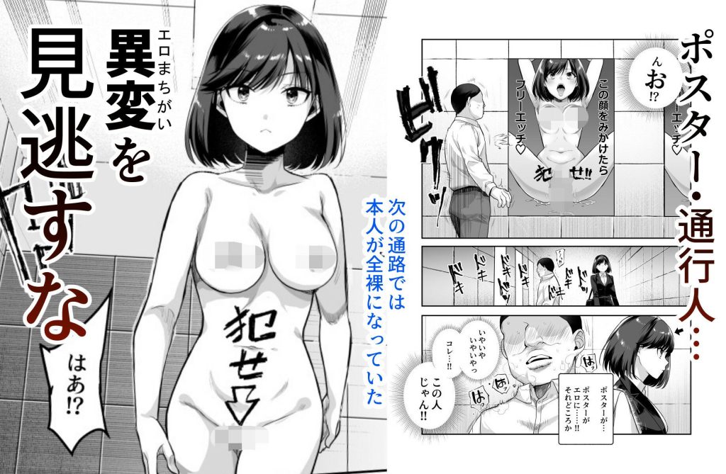 主人公は、ここがどこなのかも分からない状況に困惑しつつも、通路を進みます。最初に遭遇した異変は、なんと目の前に歩いてくる美人OLの「卑猥なポスター」! まさかこんなエロ案件だとは思わず、主人公は激しく動揺します。