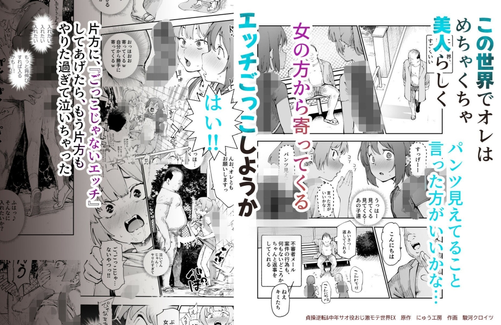 この世界では、主人公のような中年男性が「美人」として扱われ、女性たちは彼に相手をしてもらえるだけで大興奮! 公園で少女たちと「エッチごっこ」をしたり、憧れの「処女(どうてい)サラリーウーマン」の家に泊まり込んだり…と、常識では考えられないような出来事が次々と起こります。